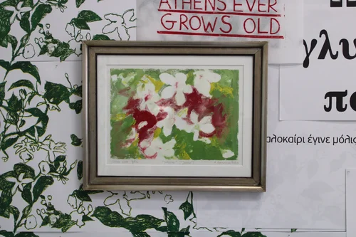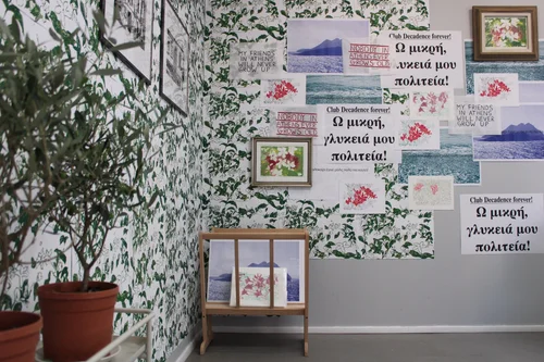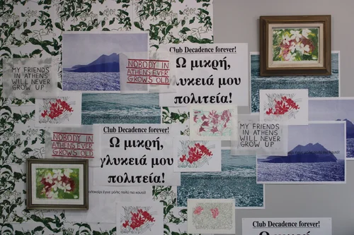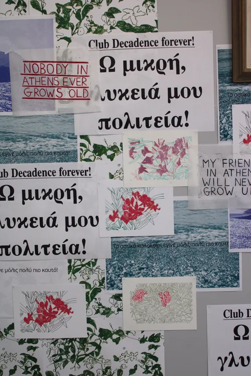 You pick up the leaflet as you venture further in. Traces of yesteryear scattered on the floor, on the walls, on the mis-matched chairs and bar stools that one finds in the smaller room, the one further in, next to the kitchen-turned-bar. On the bathroom door, a scribbled phone number, urging you to dial it “for a good time”, alongside a desperate confession, ΚΛΕΙΩ Σ'ΑΓΑΠΩ, Kleio I love you, and in that moment, you love her too.