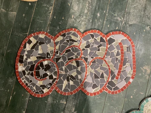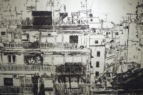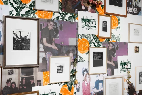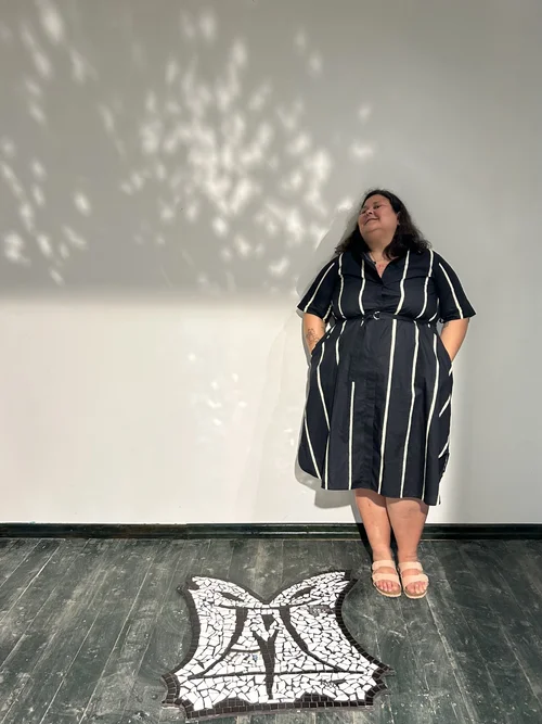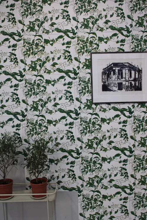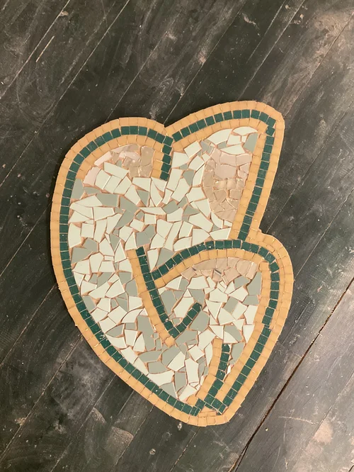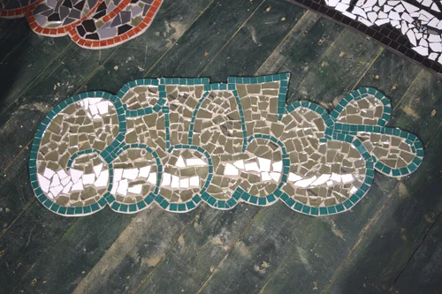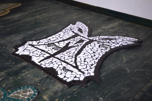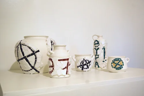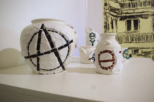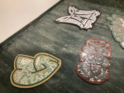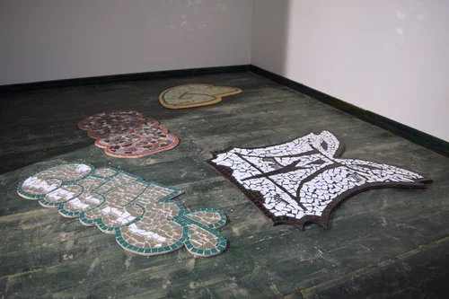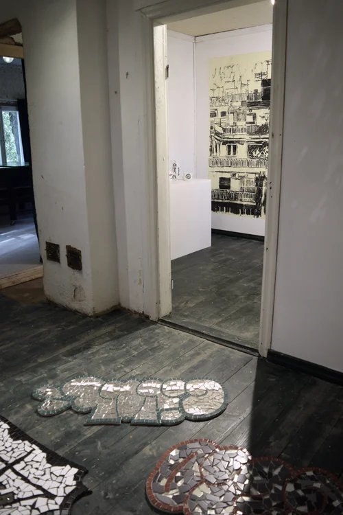 The exhibition "A Marriage" combines (or marries) two strong visual memories that the artist carries with her: Athenian graffiti, and Mediterranean floor and wall mosaics. The installation consists mainly of floor mosaics, depicting graffiti found on the streets of Athens, along with large format monoprint. This new series of work has been made especially for exhibition in VMPR's gallery, while the subject matter remains connected to the artist's overarching themes of nostalgia, music, teenage memories and collective identity.