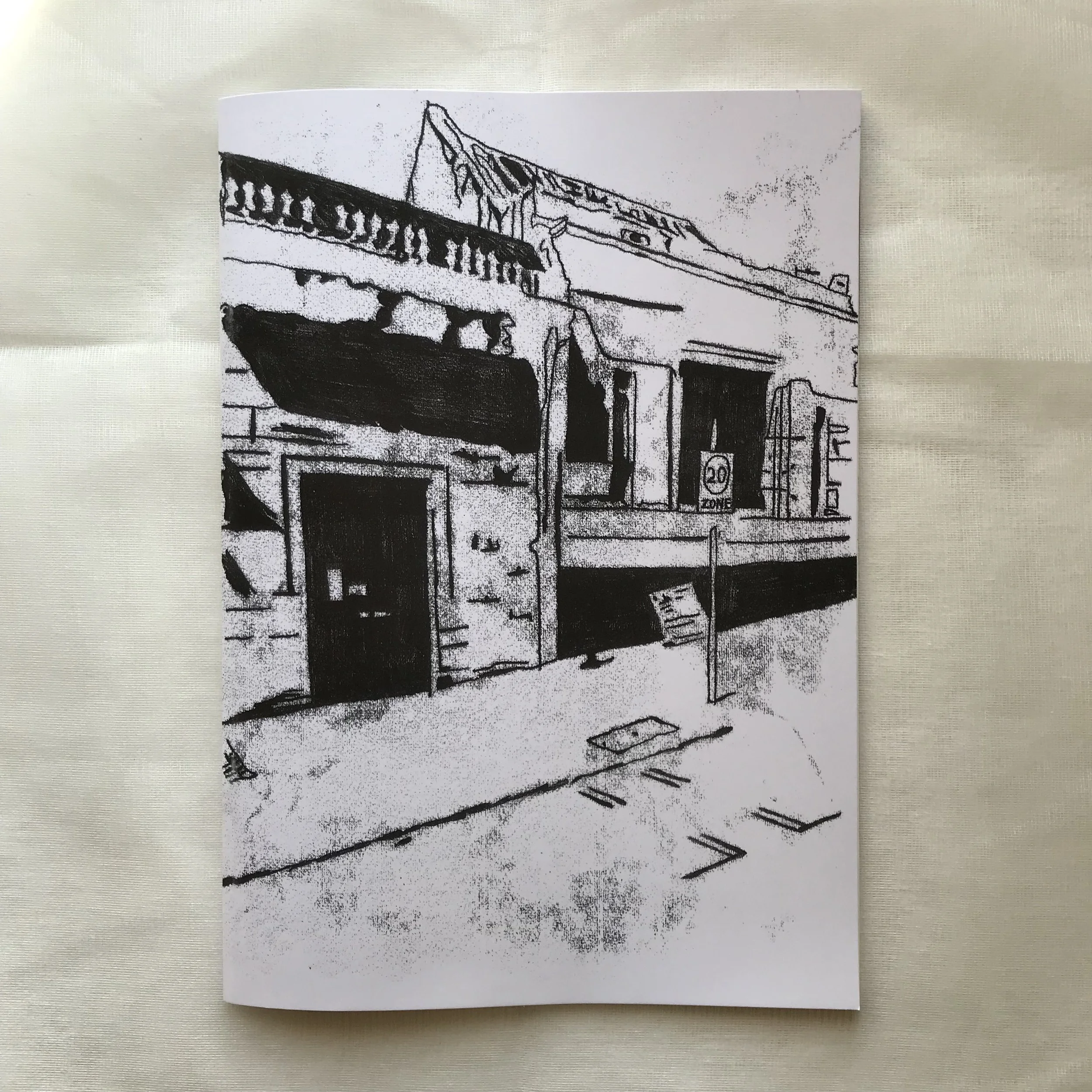 First, a heavy door; you push it open, then a few steps lead you into the space. You’re not quite sure what to expect, not this time, even though you’ve been here countless times in the past. You know the space well, the floor, so graphic, so black and white and beautiful, is now somewhat sticky with remnants of last night’s party. The drawing on your right hand side reminds you of something, was it here last time? On the wall to your left, a small picture of a building, this building but of another time.